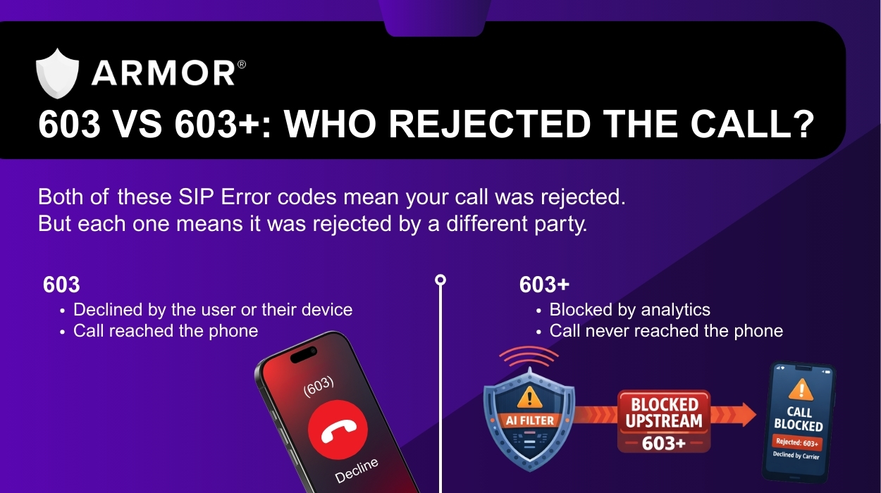 A 603+, however, tells a different story. It means a spam- or scam-detection system rejected the call before it ever reached the consumer. Think of it like a bodyguard stopping you in the hallway because you looked suspicious, then handing you a note explaining why and who to contact if they got it wrong.